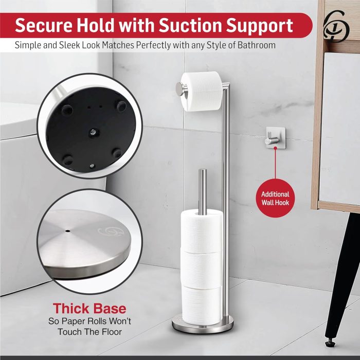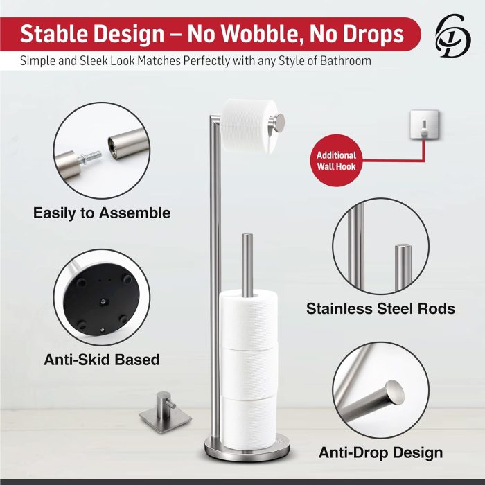 Home Diy & Tools CD Toilet Roll Holder Free Standing Stainless Steel – Chrome Finish Toilet Paper Holder Stand with Heavy Stable Base, Rustproof & Easy Assembly, Silver (with Additional Wall Hook)