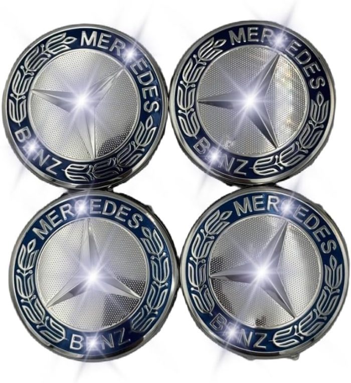 These silver and navy blue alloy wheel center hub caps come in a set of four, each measuring 75mm in diameter, and feature a laurel design. They’re designed to fit luxury vehicles, providing a sleek and sophisticated look. The hub caps are made of durable materials, ensuring long-lasting protection and style for your wheels.