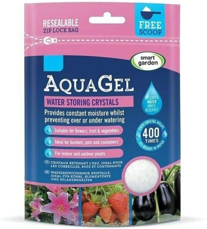 Smart Garden AquaGel Water Storing Crystals are designed to provide constant moisture to plants while preventing over or under watering. These crystals absorb and store water, releasing it as needed, and can hold up to 400 times their weight in water. They’re perfect for baskets, pots, and containers, suitable for flowers, fruits, and vegetables, and can be used for both indoor and outdoor plants.